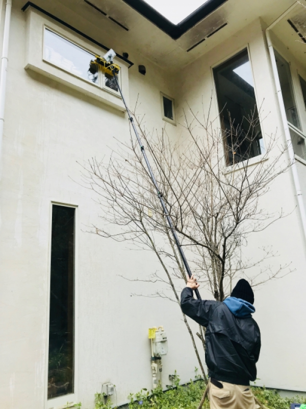 ドイツ製のウンガーポールを使い、高いところの外側の窓もスムーズに作業可。もちろん、高い脚立に登ることもないから作業者の安全性も高い!高所窓は高さや大きさ、周辺状況で料金が確定しますので、お問い合わせ下さい。
