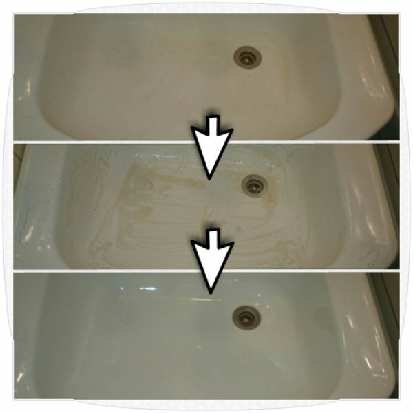 添付写真のような手洗い場、洗面ボールの手垢などの黒ズミ汚れ(酸性汚れ)の場合はご家庭にある次の物で落とすことができます。
