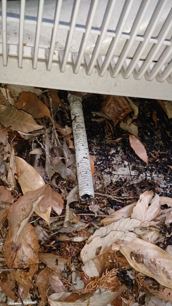 ご自宅の室外機のホースが剥き出しになっている場合は、いつこのような水漏れが起きるかわからない状況ですので、一度当店にご相談下さい。