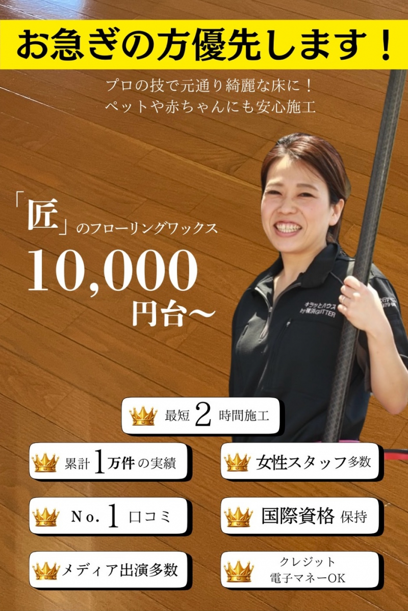 歩行路線や食卓の床など、年数と共にワックスの剥がれや汚れ、光沢減少が気になりだしたらプロのワックス剥離とワックスがけをお勧めします。ワックスを長く綺麗に保つコツもありますので、お伺いの際にお話できましたら幸いです。